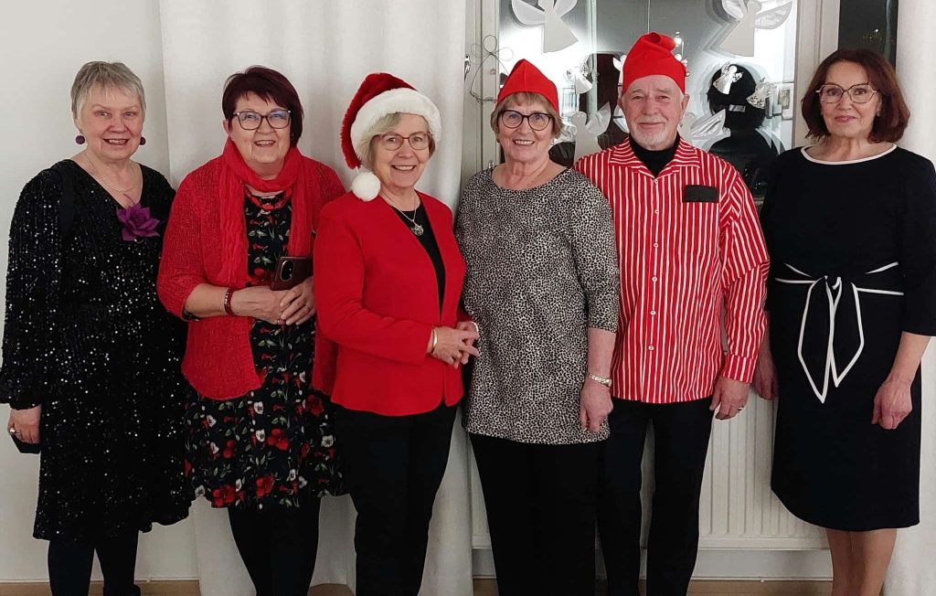 Osa opettajista ehti mukaan yhteiskuvaan juhlassa. Vasemmalta Raija Männistö, Terttu Kohtanen, Aune Vanhanen, Sirpa Tuisku, Harri Tuisku, Pirjo-Leena Ketola. Toivotamme kaikille Luetaan yhdessä -verkoston toimijoille upeaa vuotta 2026!