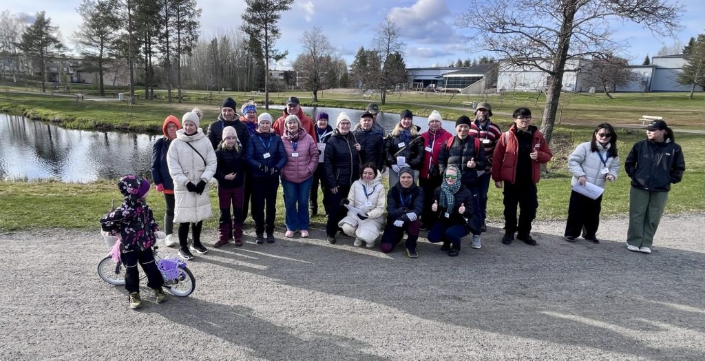 Kevätlukukauden päätimme Kauhajoen keskustan jokirantapuistossa, virkistysuimalan ja urheilutalon maisemissa. Iso osallistujajoukko jaettiin kahteen ryhmään. Kumpikin joukkue sai vuorollaan alan ammattilaisilta opastusta uusien ulkokuntoilulaitteiden käytössä ja frisbeegolfin pelaamisessa. Kaikki tyytyväisinä yhteiskuvassa (alla).